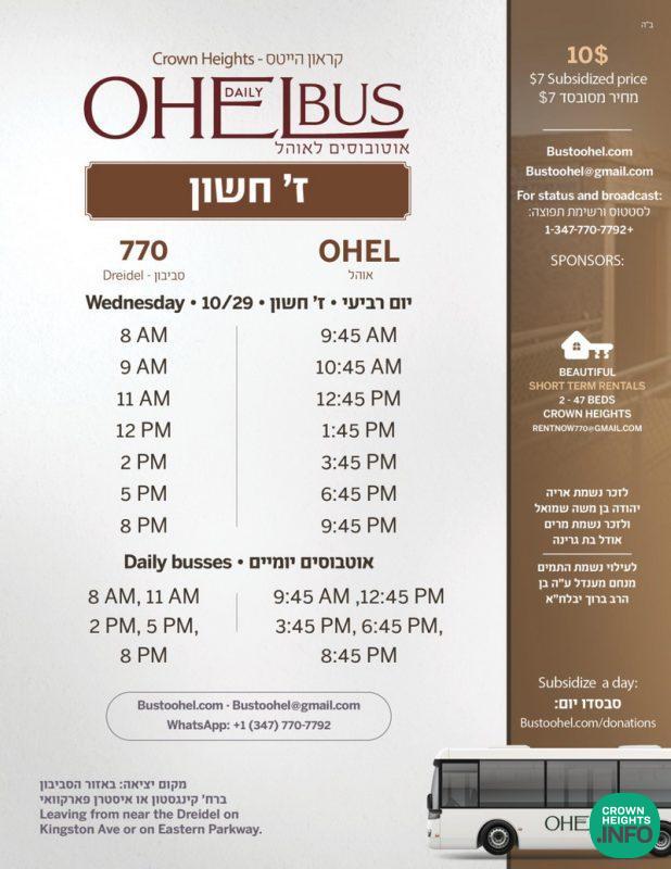 The Ohel Bus Service will be providing subsidized transportation round trip from Crown Heights to the Ohel for Zayin Cheshvan on Wednesday.