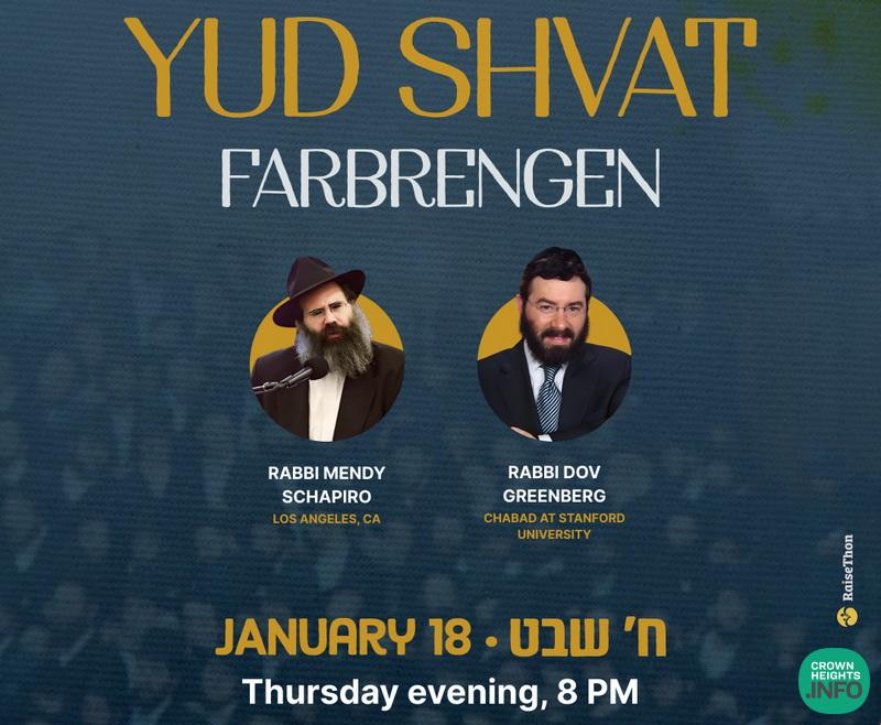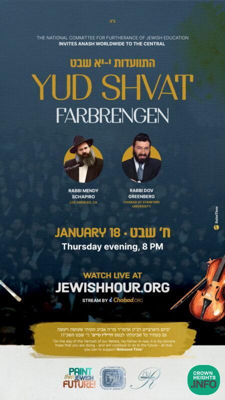 As Yud Shvat is Shabbos this year, NCFJE has announced that the annual livestream Farbrengen for Anash worldwide will take place on Thursday night, with inspiration to help us properly prepare for Yud Shvat.