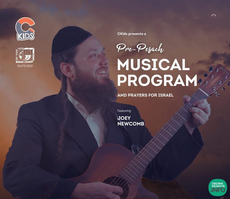 Today, at 12:30 PM EST, CKids at Merkos 302 will be hosting an exciting pre-pesach musical event featuring Joey Newcomb. Join thousands of children around the world, learn about Pesach, and daven for our brothers and sisters in the holy land. The program will include will include games, raffles, learning about Pesach, and an interactive musical event with Joey Newcomb. The event is open to all, and everyone is encouraged to join.