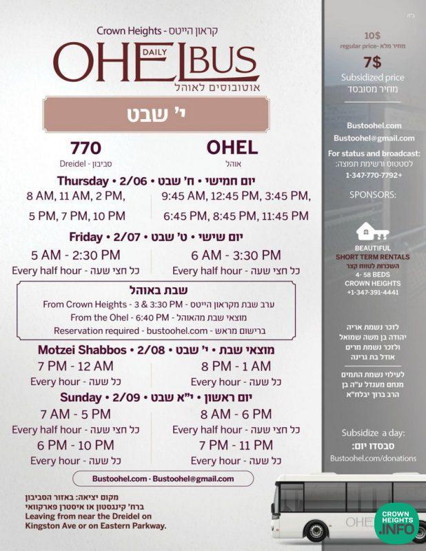 In honor of Yud Shvat, the Ohel Bus Service will be providing extra subsidized transportation round trip from Crown Heights to the Ohel from Thursday 8th of Shvat through Sunday, the 11th of Shvat.
