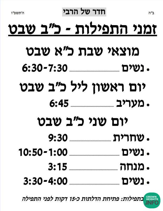 זמני התפילות בבית של הרבי ברחוב פרזידנט 1304 לרגל כ”ב שבט תשפ”ו