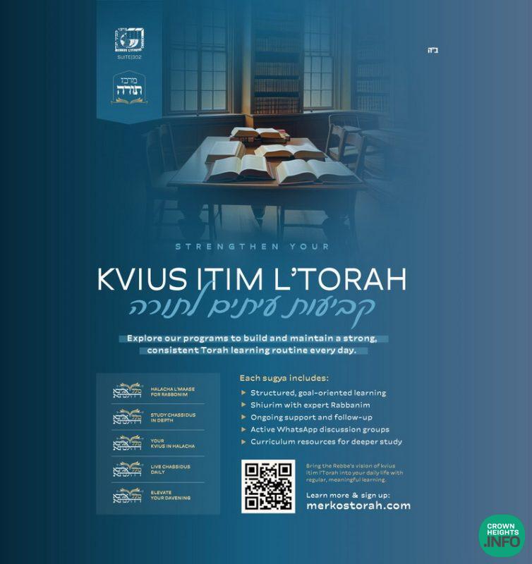 “Merkos Torah is designed to support and inspire consistency in learning Torah while balancing one’s busy schedule,” says Rabbi Mendy Kotlarsky, Executive Director of Merkos 302. “The Rebbe often emphasized that Kvius Itim L’Torah is a non-negotiable, and is the foundation of a Shliach’s success.”