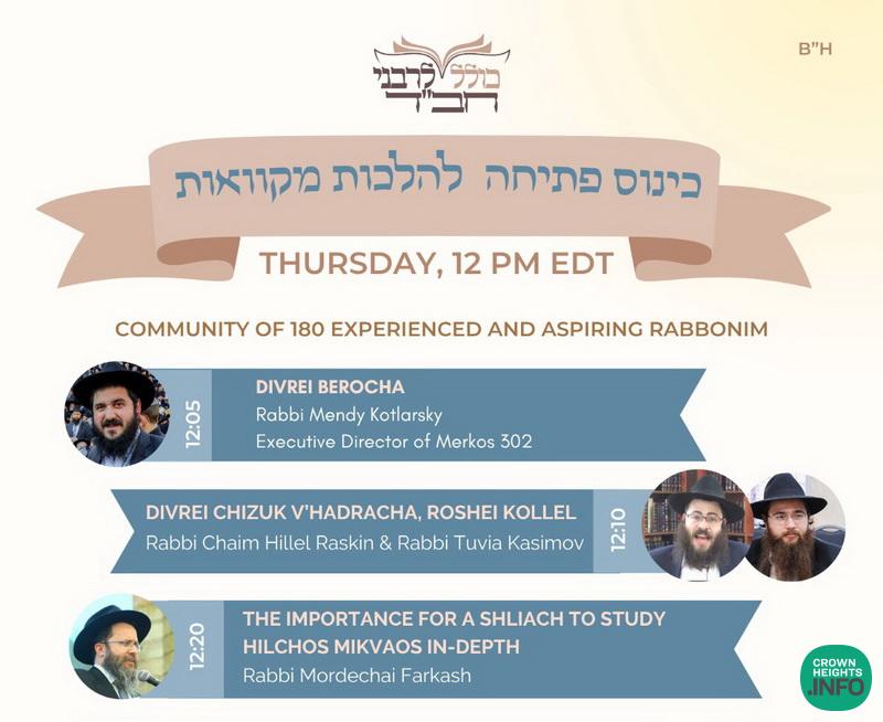 Kollel L’Rabbonei Chabad invites to community of anash and shluchim to it’s first class of the new semester on Hilchos Milvaos.