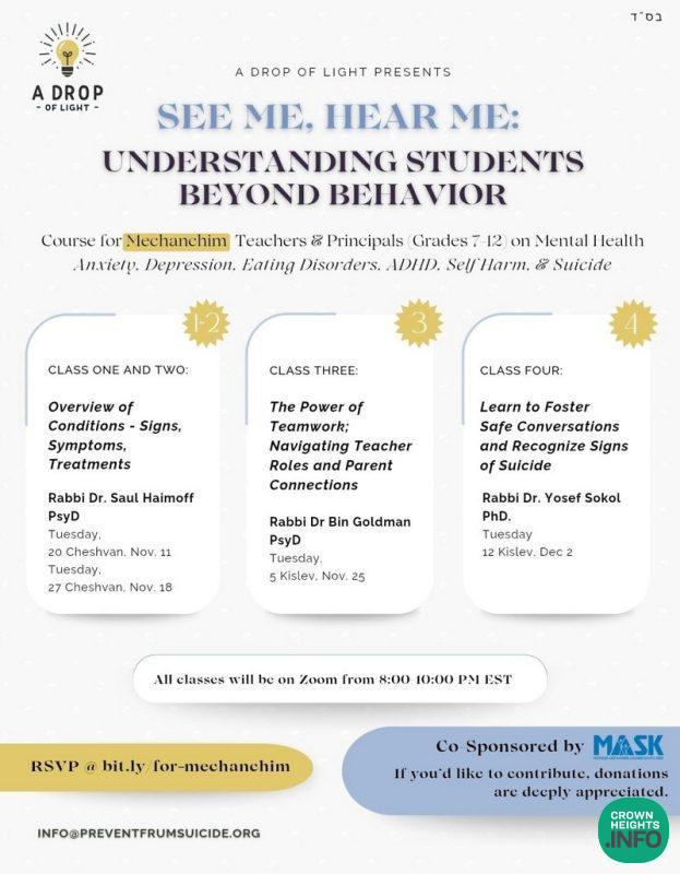 Following an incredibly successful course over the summer for mechanchos, A Drop of Light has created a course for middle and high school mechanchim. This course will b’ezras Hashem give male teachers and educators the knowledge and tools to effectively help and support their students.