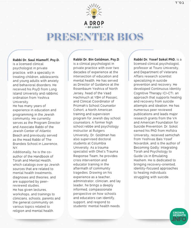 Our presenters include: Rabbi Dr. Saul Haimoff PsyD, a clinical psychologist who has also co-authored a book on Torah and Mental Health. Rabbi Dr. Bin Goldman PsyD, a clinical psychologist with over two decades of experience and formerly a high school rebbi. And Rabbi Dr. Yosef Sokol PhD, a clinical psychologist and suicide prevention and recovery specialist.