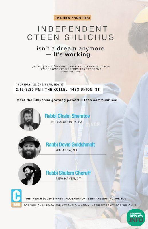 Three independent CTeen shluchim who have already seen great success with this model will be presenting a special workshop on Thursday, 22 Cheshvan (November 13).