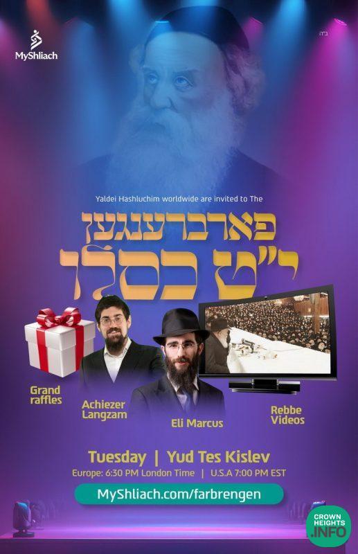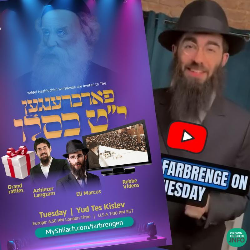 Behind the farbrengen is the MyShliach team at Merkos 302, led by Rabbi Mendy Shanowitz and Program Director Rabbi Yossi Elberg, with production and logistics by Mendy Hirsch and Moshe Weiss.