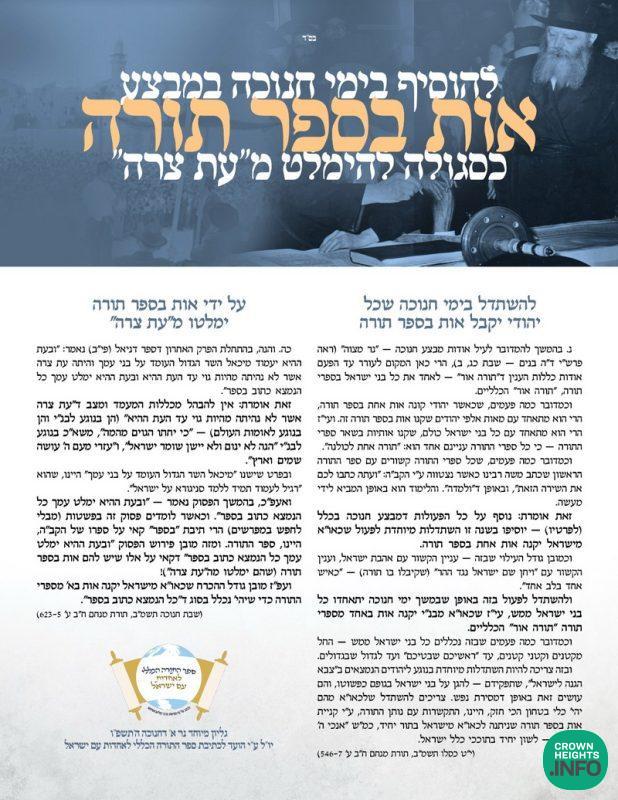 In light of recent events where Jews were killed “Al Kiddush Hashem” while taking part in “Mivtsa Chanukah,” we share part of the Rebbe’s talks about “Mivtsa Ois B’Sefer Torah” from 19th Kislev and Shabbos Chanukah 5742.