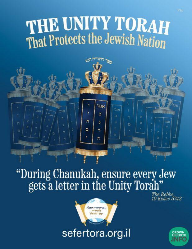 On 19th Kislev, the Rebbe asked that, in addition to the usual Chanukah efforts, special care be taken that each Jew acquires a letter in the “Unity Torah”.
