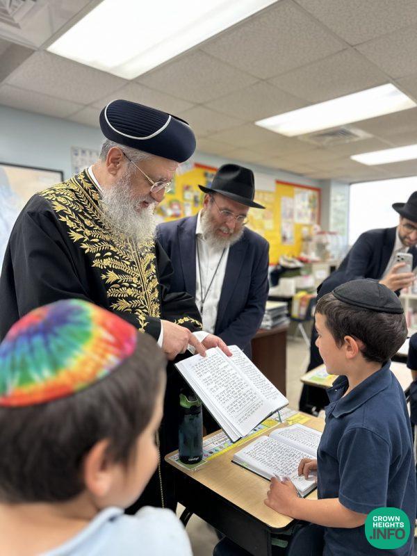 Accompanied by Rabbi Yossi Zavdi and Rabbi Mendy Cass of LEC, Rabbi Chay Amar of Chabad of Golden Beach, and Rabbi Yosef Galimidi of the Edmund Safra Synagogue, Rabbi Yosef toured some of the classrooms with Boys Elementary School Principal Rabbi Moshe Stern, interacting with the students and asking them questions on what they were learning. The younger boys practiced their kriyah skills and read from their siddurim and the older boys shared what they were currently studying for the Chidon Sefer Hamitzvos.