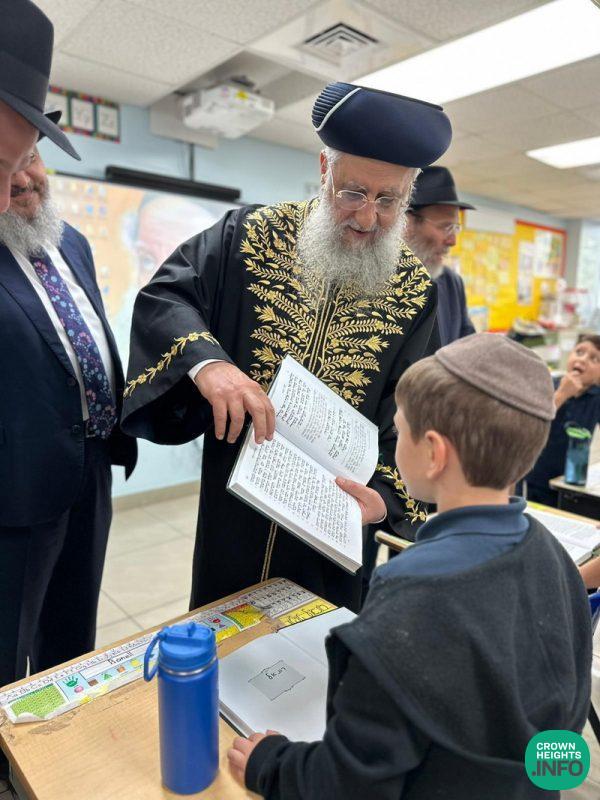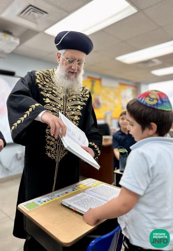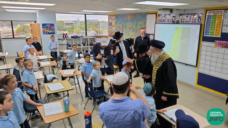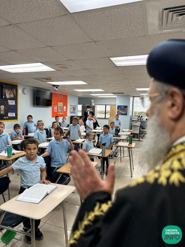 Accompanied by Rabbi Yossi Zavdi and Rabbi Mendy Cass of LEC, Rabbi Chay Amar of Chabad of Golden Beach, and Rabbi Yosef Galimidi of the Edmund Safra Synagogue, Rabbi Yosef toured some of the classrooms with Boys Elementary School Principal Rabbi Moshe Stern, interacting with the students and asking them questions on what they were learning. The younger boys practiced their kriyah skills and read from their siddurim and the older boys shared what they were currently studying for the Chidon Sefer Hamitzvos.
