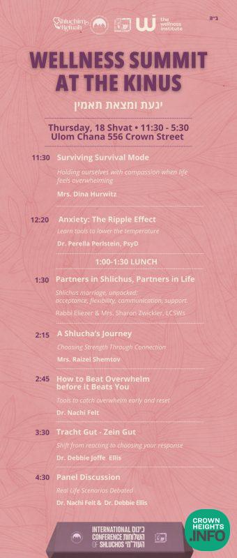 The Summit will take place on Thursday, 18 Shvat, at Ulam Chana, 556 Crown Street, from 11:30 AM to 5:30 PM. Shluchos can partake by registering to the Shluchim Refuah Track at kinus.com/registration/workshops.