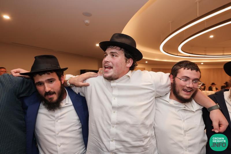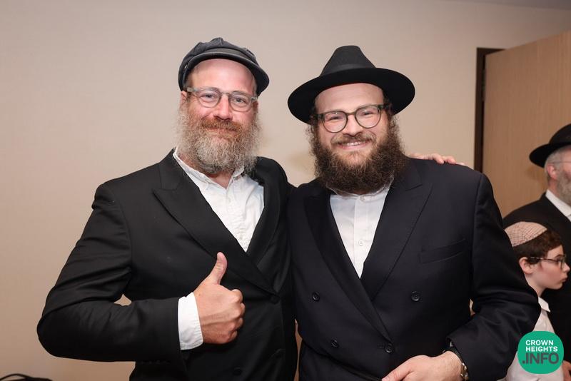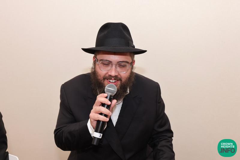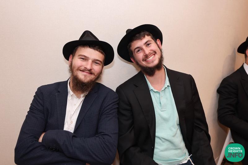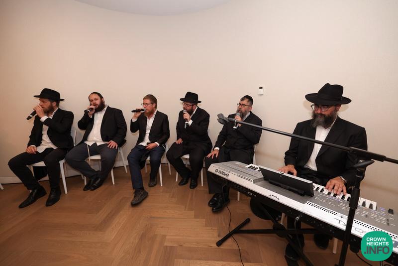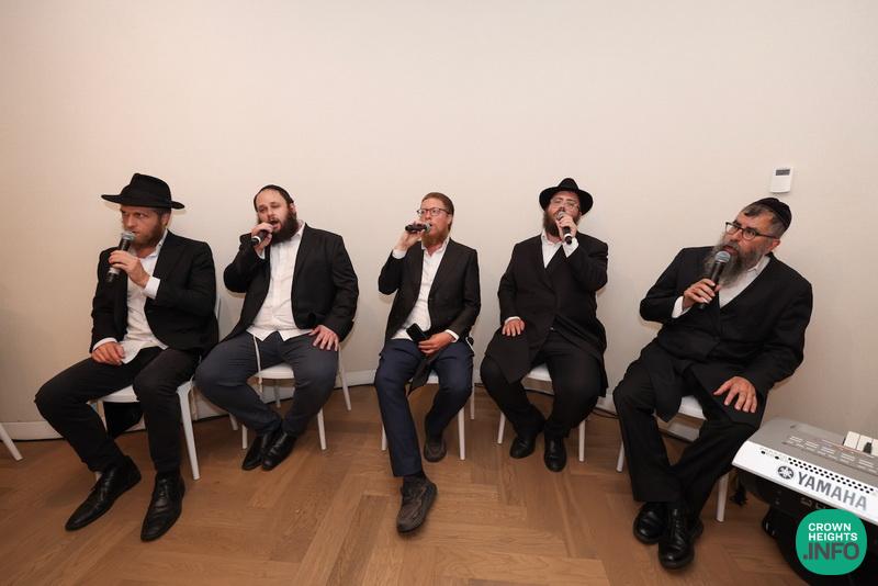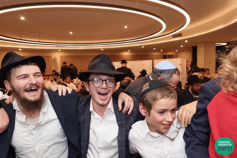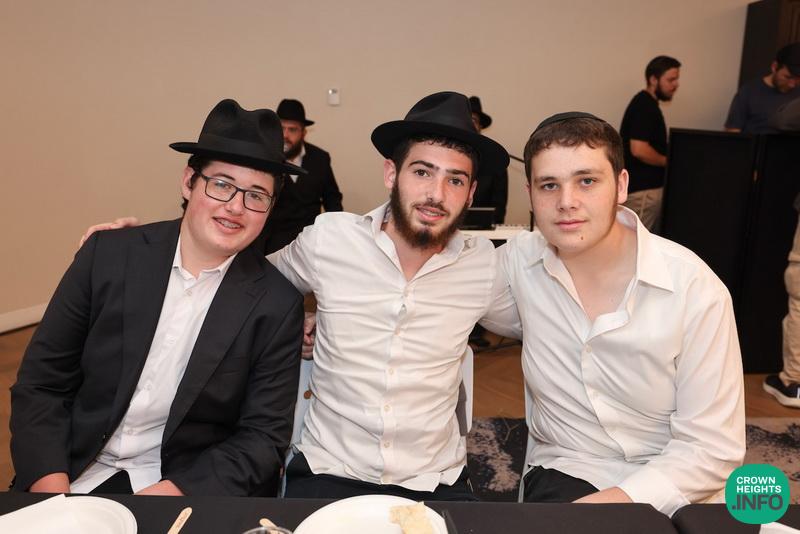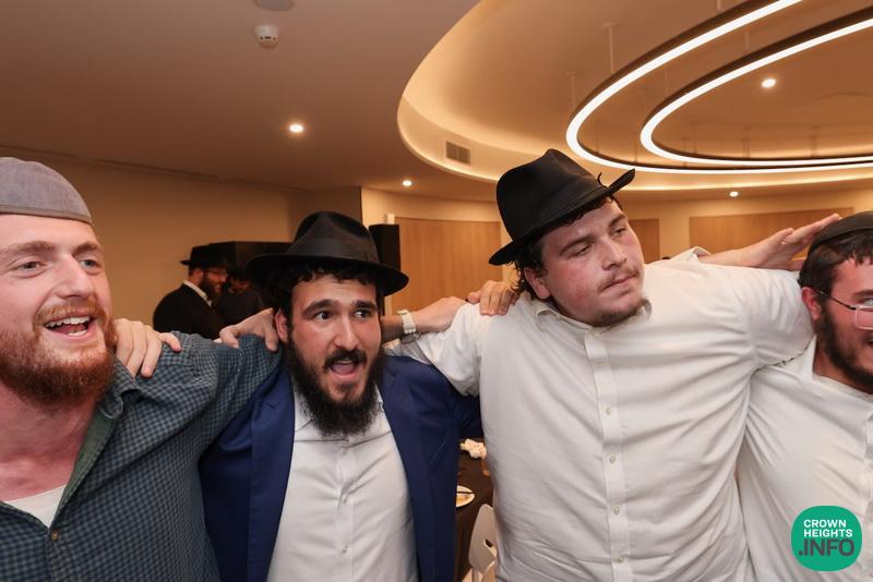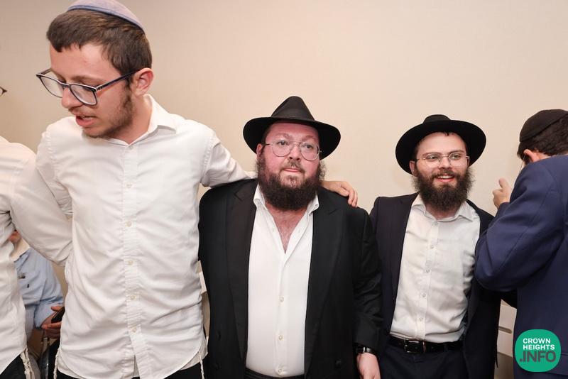 Throughout the evening, the Mezamrim Choir enhanced the program with stirring song, featuring Rabbi Yehoshua Niasoff, Rabbi Yehuda Niasoff, Rabbi Chaim Koncepolski, Rabbi Noach Koncepolski, Rabbi Meir Vilenkin, and Rabbi Menachem Feldman. Each, a respected chazan in his own right, and together they brought extraordinary joy, song, and dancing to the farbrengen, particularly among the bochurim shluchim in attendance.