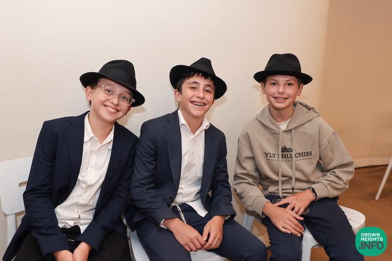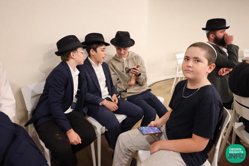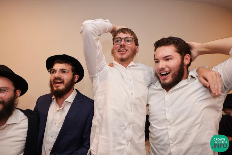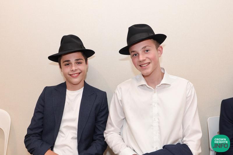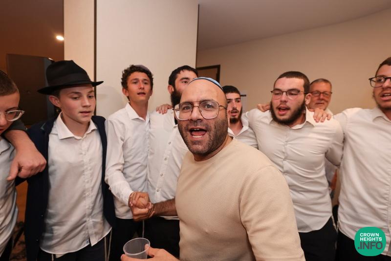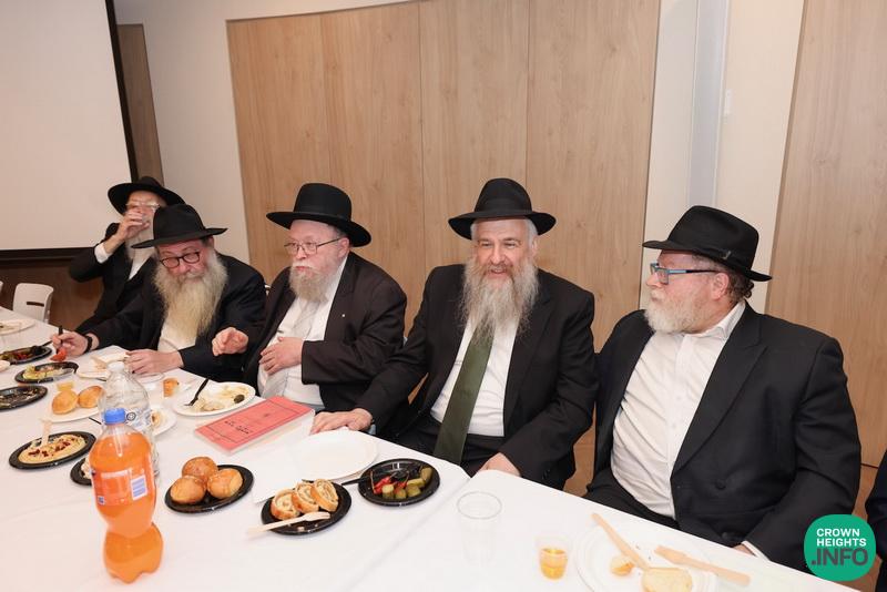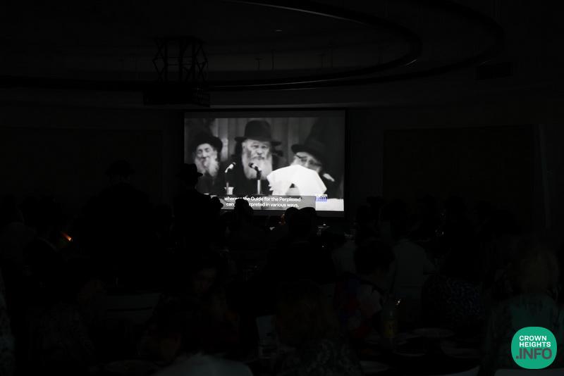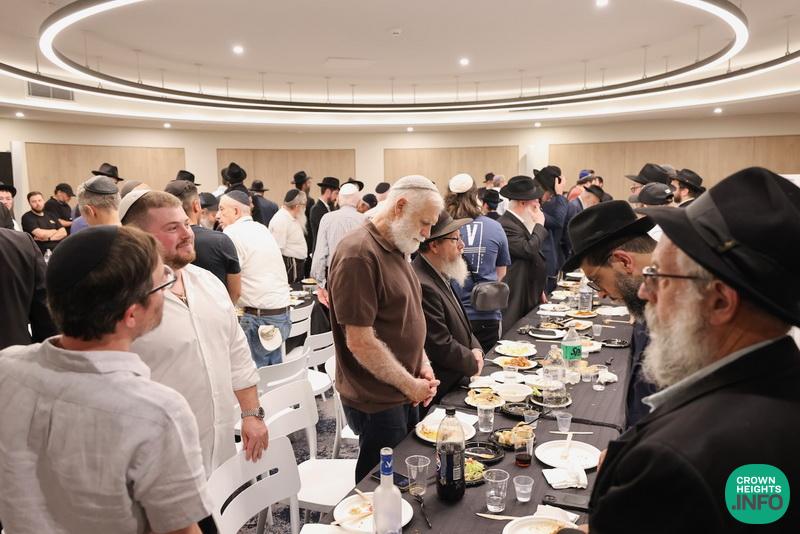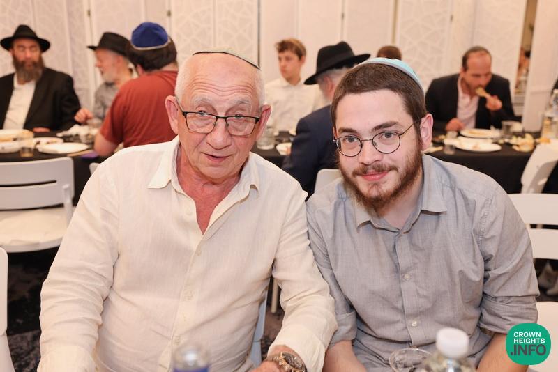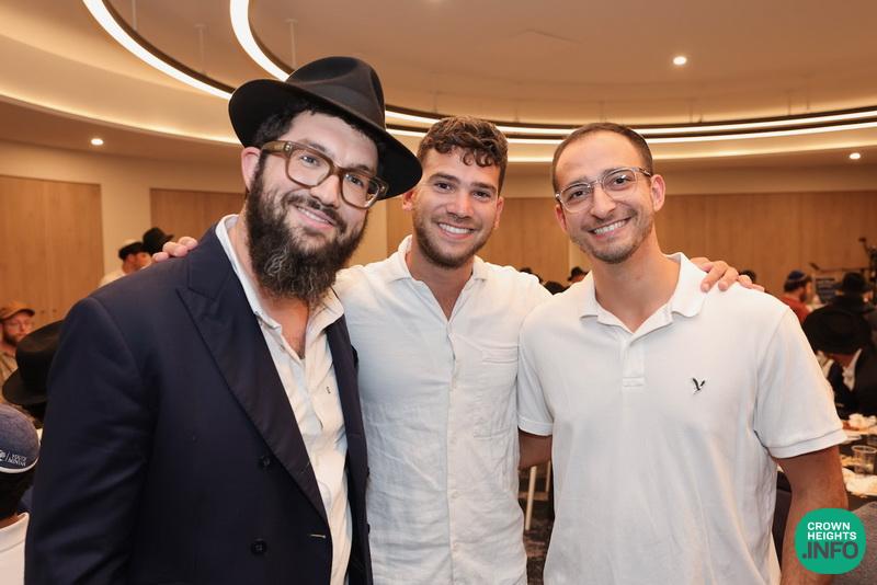 Throughout the evening, the Mezamrim Choir enhanced the program with stirring song, featuring Rabbi Yehoshua Niasoff, Rabbi Yehuda Niasoff, Rabbi Chaim Koncepolski, Rabbi Noach Koncepolski, Rabbi Meir Vilenkin, and Rabbi Menachem Feldman. Each, a respected chazan in his own right, and together they brought extraordinary joy, song, and dancing to the farbrengen, particularly among the bochurim shluchim in attendance.