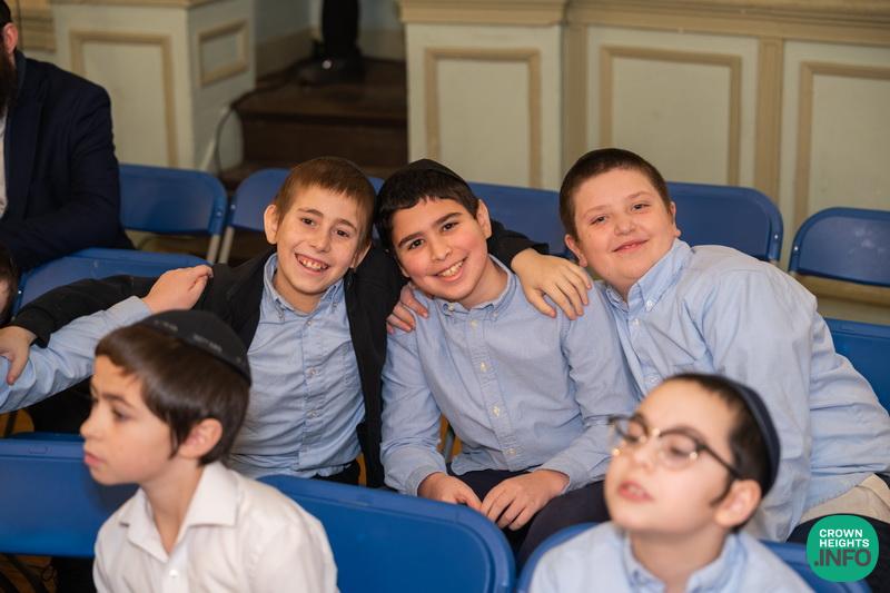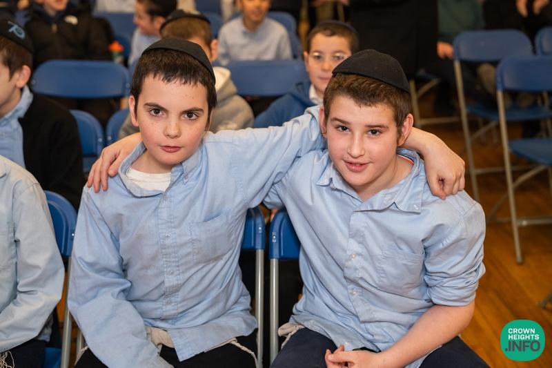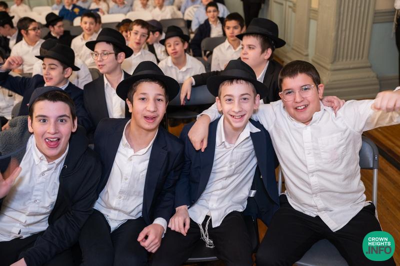 Being that the Siyum Harambam was on Chamisha Asar Bshvat, the talmidim watched a powerful Rebbe video from a Chamisha Asar B’Shevat farbrengen, featuring the Rebbe eating from the Shivas Haminim, and a Sicha from a 15 Shvat Rally to Tzivos Hashem.
