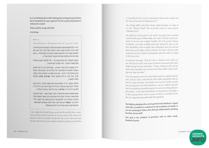 At www.tutaltz.com/aspiration, you can download a free booklet titled Aspiration, adapted from the larger Moshiach Mindset textbook. While not the full maamar, it guides the learner through its central themes. The material is divided into clear sections, includes original sources with translation, offers structured explanations, and provides reflective prompts to facilitate thoughtful engagement.