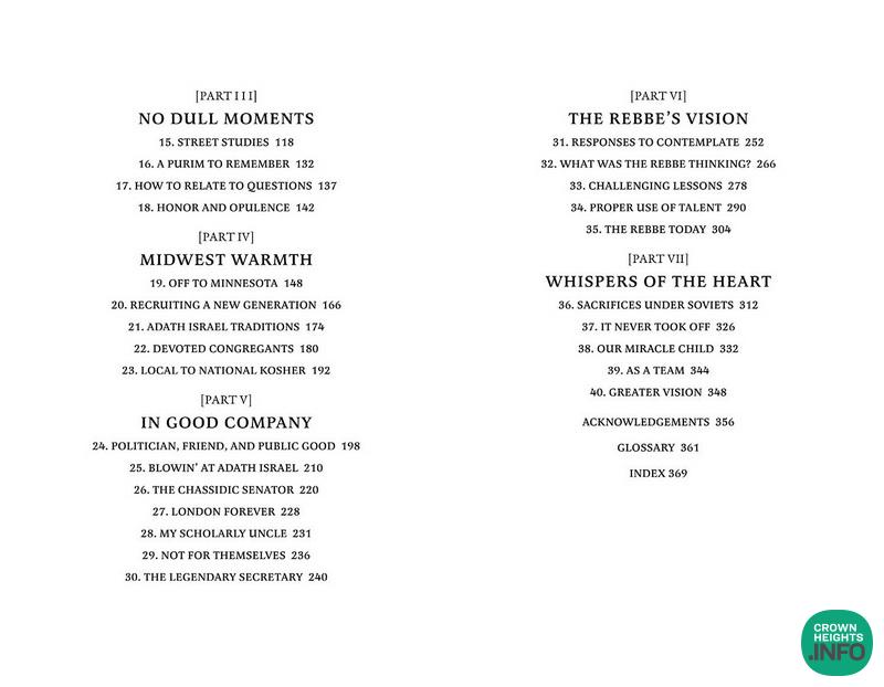The book includes chapters about prominent Chabad luminaries such as Rabbi Chaim Hodakov, Rabbi Zalman Shimon Dvorkin, and Rabbi Zalman Posner.