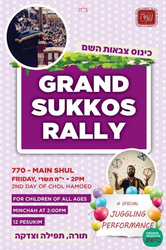 Friday at 2:00PM: Grand Sukkos Rally To Be Held in 770 A Grand Sukkos Rally will be held for children of all ages in 770 Friday, starting at 2:00pm. The rally will include the 12 Pesukim and a juggling performance.