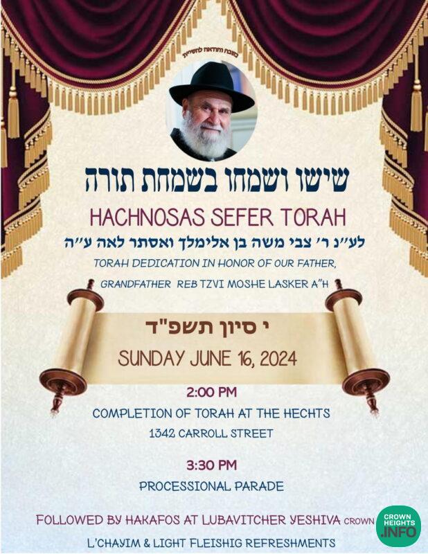 The Lasker Family will be hosting a Hachnasas Sefer Torah in Crown Heights Sunday, June 16th, in honor of Reb Tzvi Moshe Lasker OBM.
