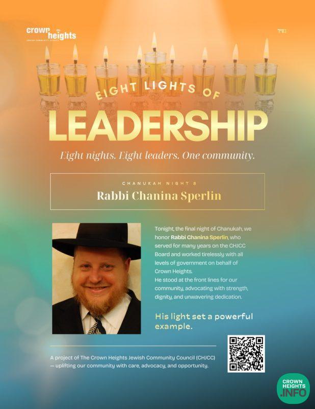 Tonight, we honor Rabbi Chanina Sperlin, a former member of the Crown Heights Jewish Community Council, a leader who stood at the front lines of our neighborhood for decades.