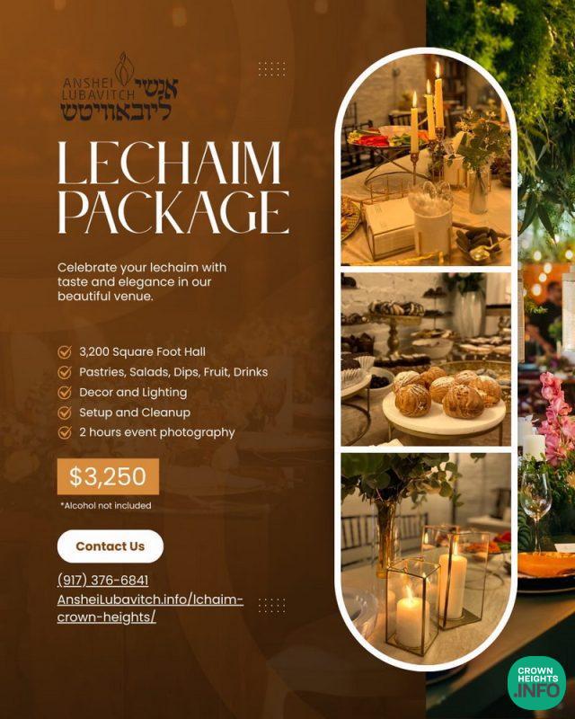 The package is available for booking now. For inquiries or to book your Lechaim, please contact Yitzy of SilverLine Events at 917-376-6841 or visit AnsheiLubavitch.info/lchaim-crown-heights.