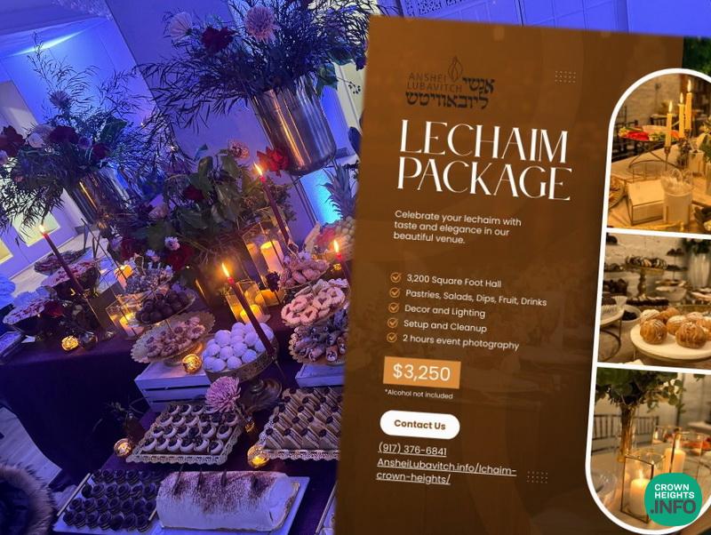 The package is available for booking now. For inquiries or to book your Lechaim, please contact Yitzy of SilverLine Events at 917-376-6841 or visit AnsheiLubavitch.info/lchaim-crown-heights.