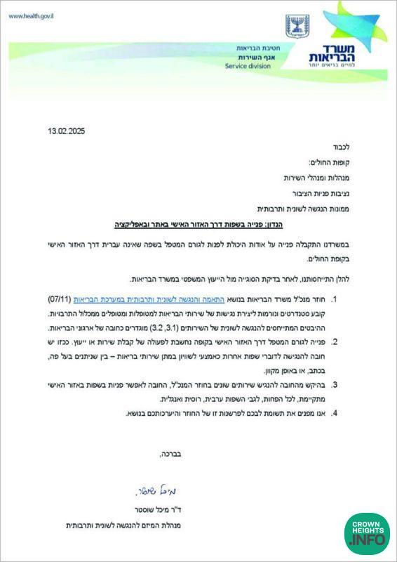 In response to the outcry, Chaim V’Chessed reached out to the Health Ministry, which has now issued a new directive to all Kupot Cholim. Dr. Michal Schuster, director of the ministry’s Accessibility Department, sent a detailed letter instructing the health funds that foreign languages must not only be permitted in communications but are, in fact, required—especially for English, Russian, and Arabic.