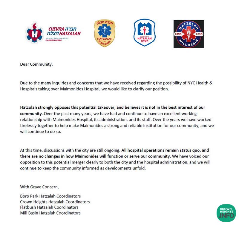 Crown Heights Hatzalah joined Hatzalah Divisions across Brooklyn in publicly opposing an attempt by NYC to take over Maimonides Medical Center in Boro Park, A Hospital used extensively by the Orthodox Jewish communities of Brooklyn and beyond.