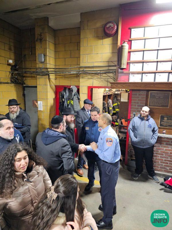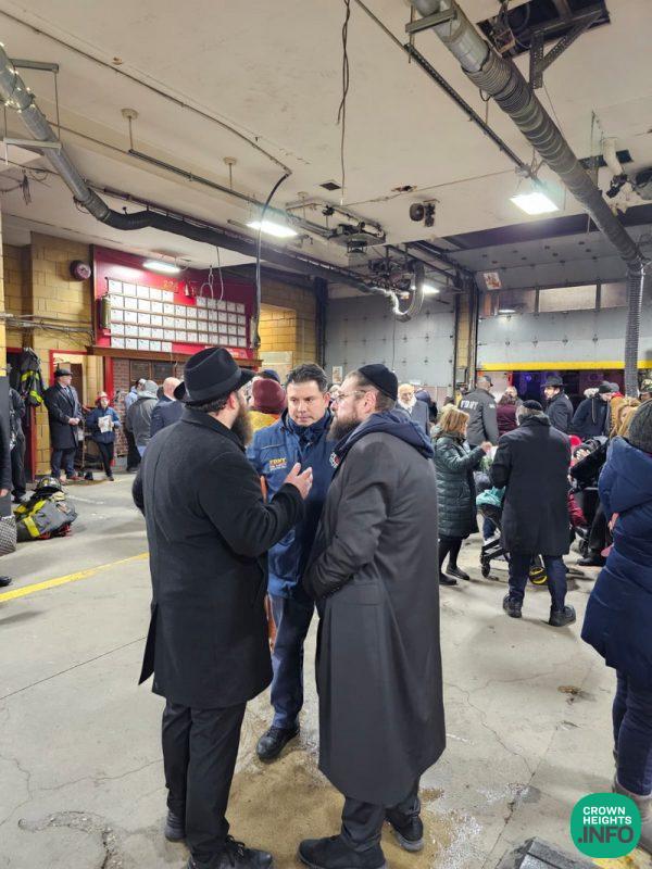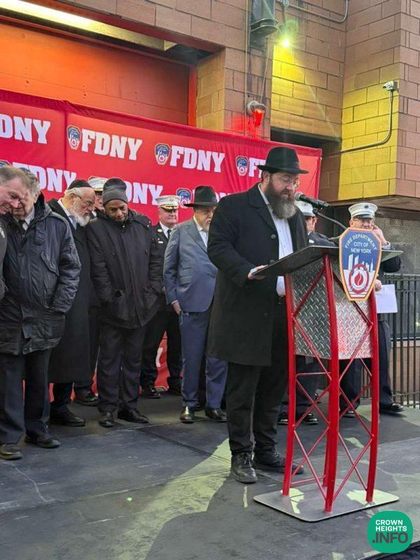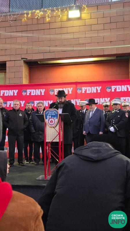 Speaking at the event was Rabbi Mendy Hershkop, a Coordinator of Crown Heights Shomrim and community figure. Starting his speech, he opened with a Kapital Tehillim, tying the meaning of the Tehillim with the leadership and life-saving mission of the FDNY. He ended with a lesson from Torah on the two fires found in this world, and how one must remain watched and tended for benefit, whole the other, the heavenly fire, always provides warmth and safety to us on earth.