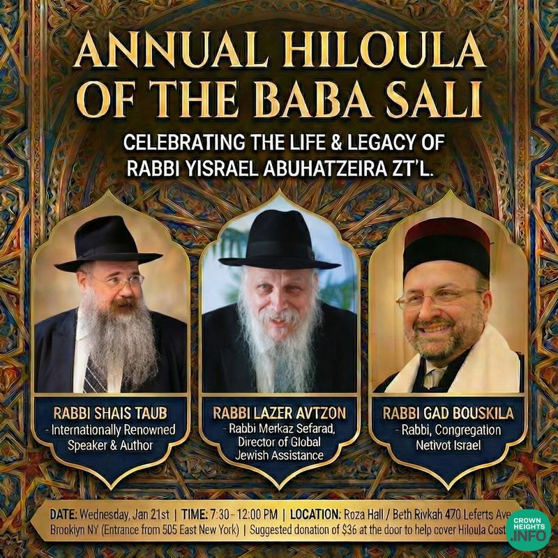 The 42nd Annual Hiloula of the Baba Sali זצוק”ל, will take place this Wednesday evening at the Roza Hall of Beth Rivkah Lefferts at 7:30 pm. Entrance from 470 Lefferts and/or 505 East New York Avenue.