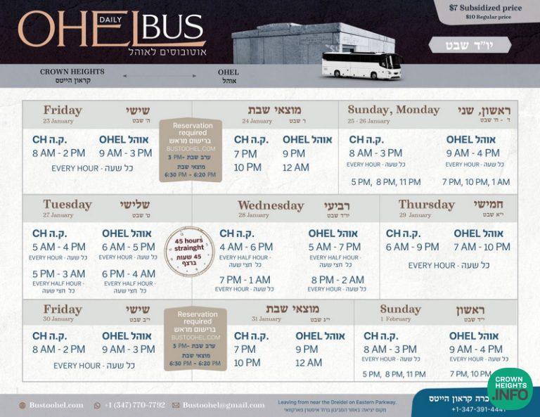 The Bus To The Ohel, which provides a subsidized bus service between Crown Heights and the Ohel, has released its Yud Shvat Schedule, including the week leading up to the auspicious day.