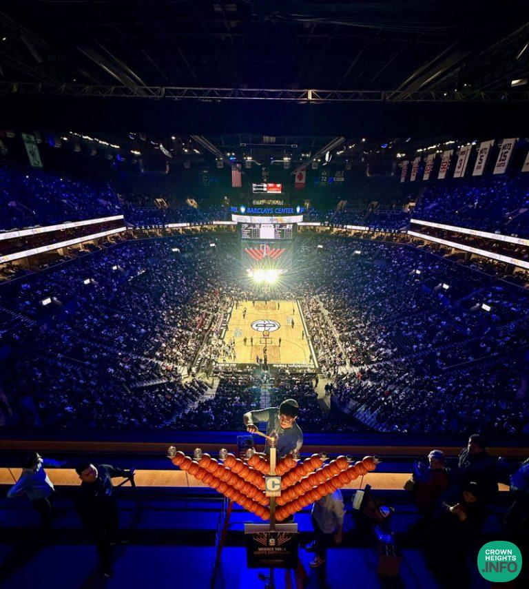 Standing tall at the Barclay’s Center in downtown Brooklyn is the CTeen Menorah, shining brightly as it was lit during a packed house basketball game.