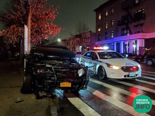 A blue Revel electric scooter – between two cars on Rogers Ave in Crown Heights – got pancaked Motzei Shabbos after a car rammed into a group of parked cars.