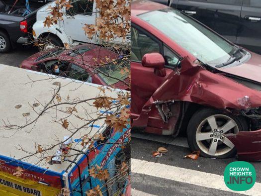 The crash occurred at approximately 10:15am Tuesday on Kingston Ave between Union Street and Eastern Parkway when the driver went nose first into a white box truck parked outside Chocolatte.