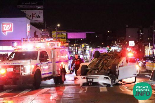 A car driving on Utica Ave overturned Motzei Shabbos after swerving to miss a pedestrian crossing the street.