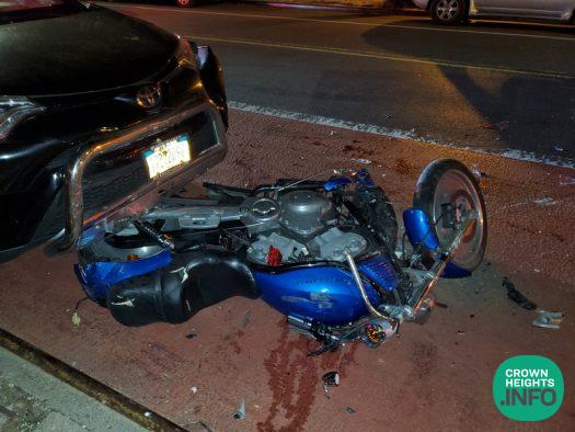 A late night crash on Utica Ave in Crown Heights left a mangled motorcycle and two other damaged vehicles Motzei Shabbos, after Jeep appeared to have crashed into a series of parked cars.