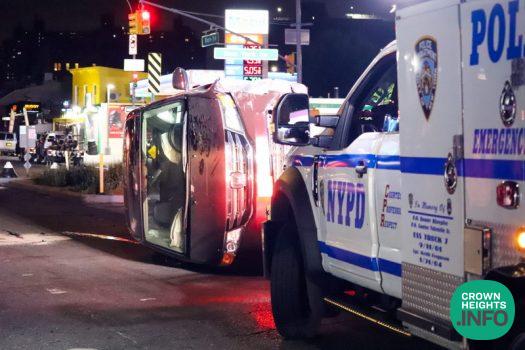 A minivan that overturned on Empire Blvd in Crown Heights thankfully protected its occupants Motzei Shabbos, sending two people to the hospital without life-threatening injuries.