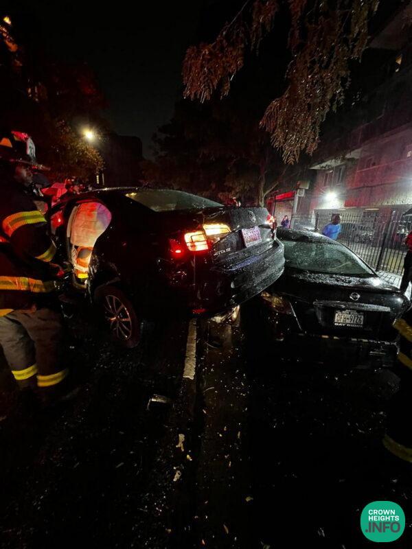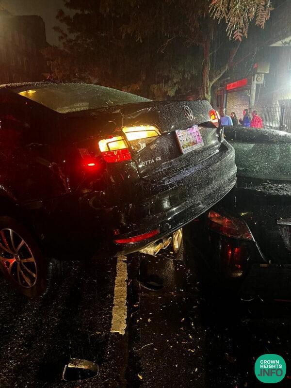 The near midnight crash took place at the intersection of Troy Ave and Empire Blvd with the black Volkswagen flipping onto trunk of a parked Nissan vehicle.