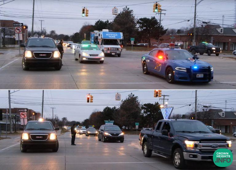 An enormous car Menorah parade, complete with Mitzvah Tanks and police escort, took to the streets of Detroit, Michigan Monday, brightening up the city and showing Jewish pride.