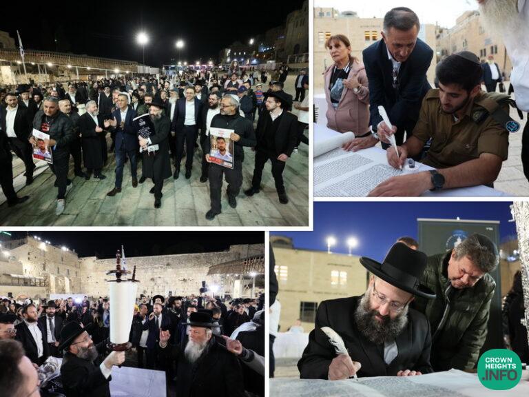 In an emotional and uplifting ceremony at the Western Wall, with the participation of dozens of families of captives, bereaved families, and displaced families from the south and north, two Torah scrolls were dedicated tonight to the Western Wall, and the writing of dozens of Torah scrolls began, which will be placed in the synagogues in the Gaza Envelope communities and on IDF bases.