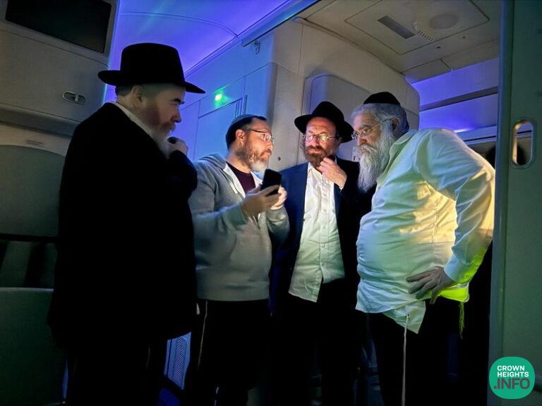 Shliach Rabbi Yitzchok Minkowicz from Chabad Lubavitch of Southwest Florida is on his way to Eretz Yisroel leading a mission of Chizuk with Rabbi Kasriel Shemtov, Rabbi Shloimy Gestetner from Mayanot in Jerusalem, and Josh Spodek of Boca Raton Synagogue. While on an El Al Flight from Miami to Israel they were spotted discussing the Matzav in Israel and how they can be Mechazek the people and soldiers as well as the families of the hostages and wounded.