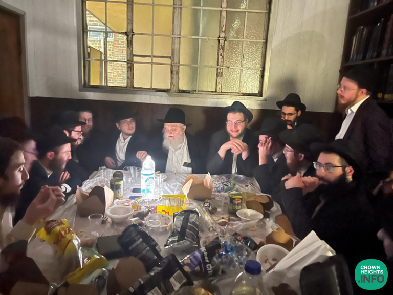 Farbrenging to the light of a single flashlight, Rabbi Zarchi from the 770 Yeshiva can be seen giving Chizuk to the bochurim at this late night Farbrengen in 770.