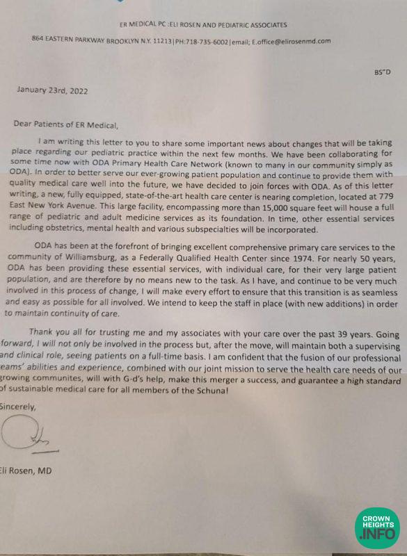 As a jumpstart to the new health center, DR. Eli Rosen’s Pediatrics’ office has announced its plans to merge with the ODA. The news was announced in a letter to the community, where they write that the decision was made to “better serve our ever-growing patient population and continue to provide them with quality medical care well into the future.”