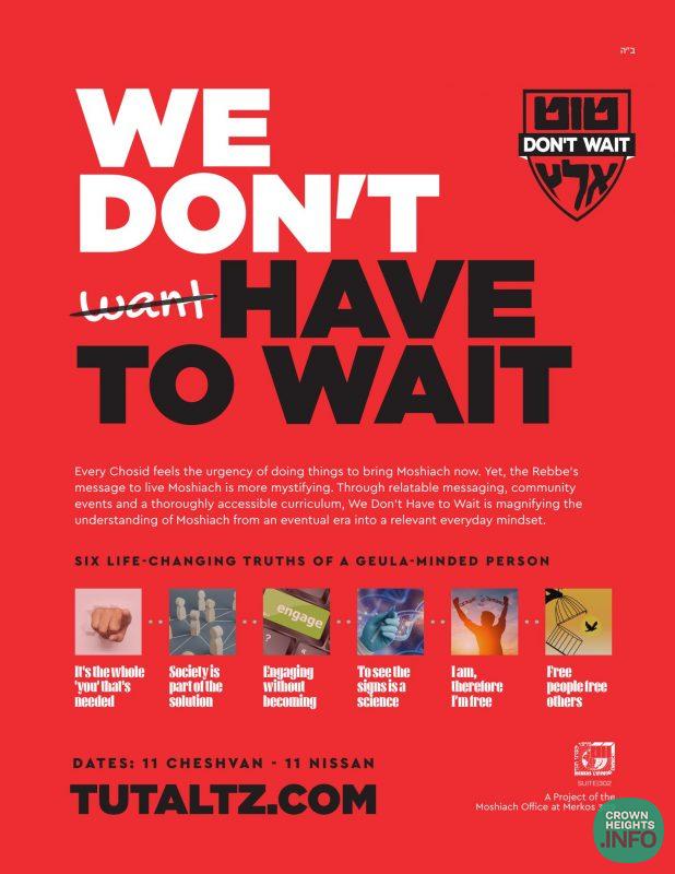 Here is where ‘We Don’t Have to Wait’ is changing the picture. This program puts the elusive goal of making ‘Moshiach’ relevant in its crosshairs. The focus is entirely about right here and right now – living our current daily lives with a Moshiach mindset. This isn’t about studying the intricacies of the Beis Hamikdash or the wonders of Toraso shel Moshiach; this is about changing perspective and being conscious of a Moshiach reality today, tomorrow, and yesterday, too.