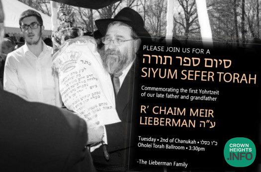 The family of Rabbi Chaim Lieberman OBM invites the community to join them this coming Tuesday in welcoming a new Sefer Torah in honor of his first Yartzeit.