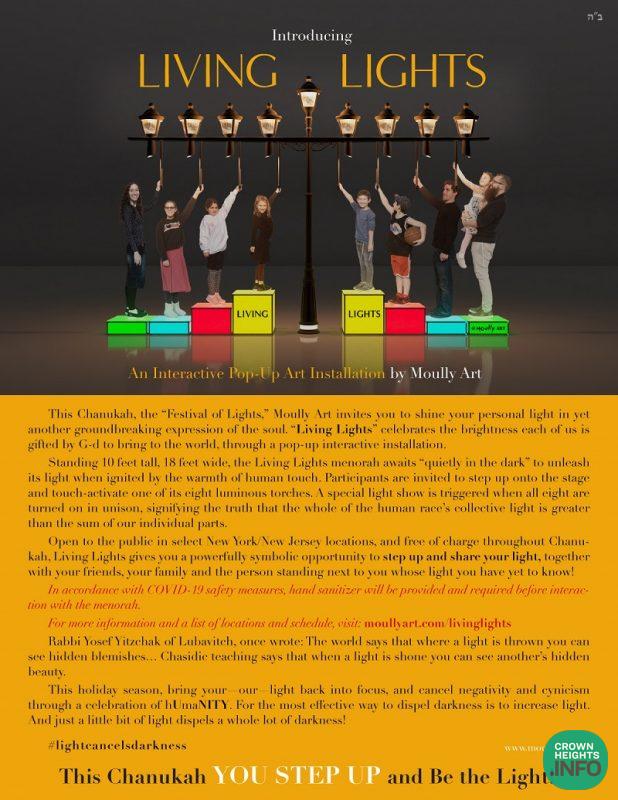 Open to the public in select New York/New Jersey locations, and free of charge throughout Chanukah, Living Lights gives you a powerfully symbolic opportunity to step up and share your light, together with your friends, your family and the person standing next to you whose light you have yet to know!