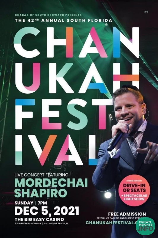 The 42nd Annual South Florida Chassidic Chanukah festival features a full concert with the highly popular Jewish superstar Mordechai Shapiro, and presents a spectacular light show.