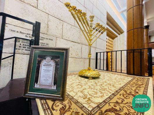 At the conclusion of Mincha prayers on the eve of Chanuka in the Central Shul’s main sanctuary, the large crowd, including members and guests, moved over to the southern wall in order to light the first Chanuka light. The candle was emotionally lit by philanthropist Mr. Yehuda Kanievsky, friend and supporter of the Marina Roscha shul in Moscow’s center, in gratitude for his gift – a beautiful goldplated menorah, which in its similarity to the original that stood in the Holy Temple, arouses anticipation for the coming of Moshiach speedily in our days.