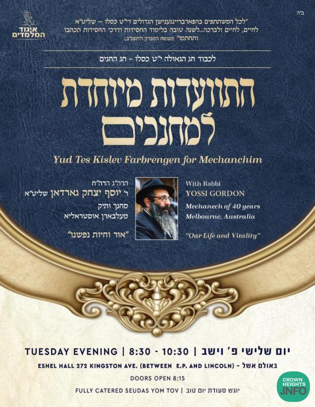 Each year, on the Rosh Hashana for Chassidus, Crown Heights is blessed with an abundance of special farbrengens. But there is one farbrengen that earns special recognition: the annual Yud Tes Kislev farbrengen for mechanchim arranged by Chabad chinuch organization Igud Hamelamdim