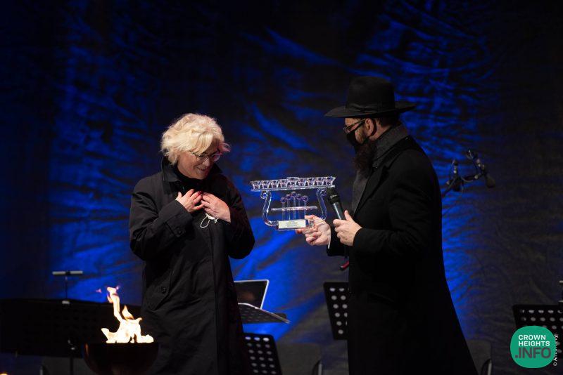 Israeli Ambassador Jeremy Issacharoff and U.S. Embassy Chargé d’Affaires Clarc Price joined all speakers on stage to light the torch. Justice Minister Christine Lambrecht was honored with a handmade glass Hanukkiah for her tireless commitment to German-Jewish coexistence.